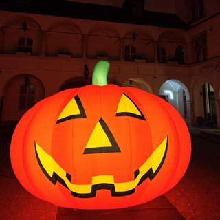 Nafukovacia štruktúra v tvare tekvice. Dizajnový prvok pre halloween párty a detské podujatia.